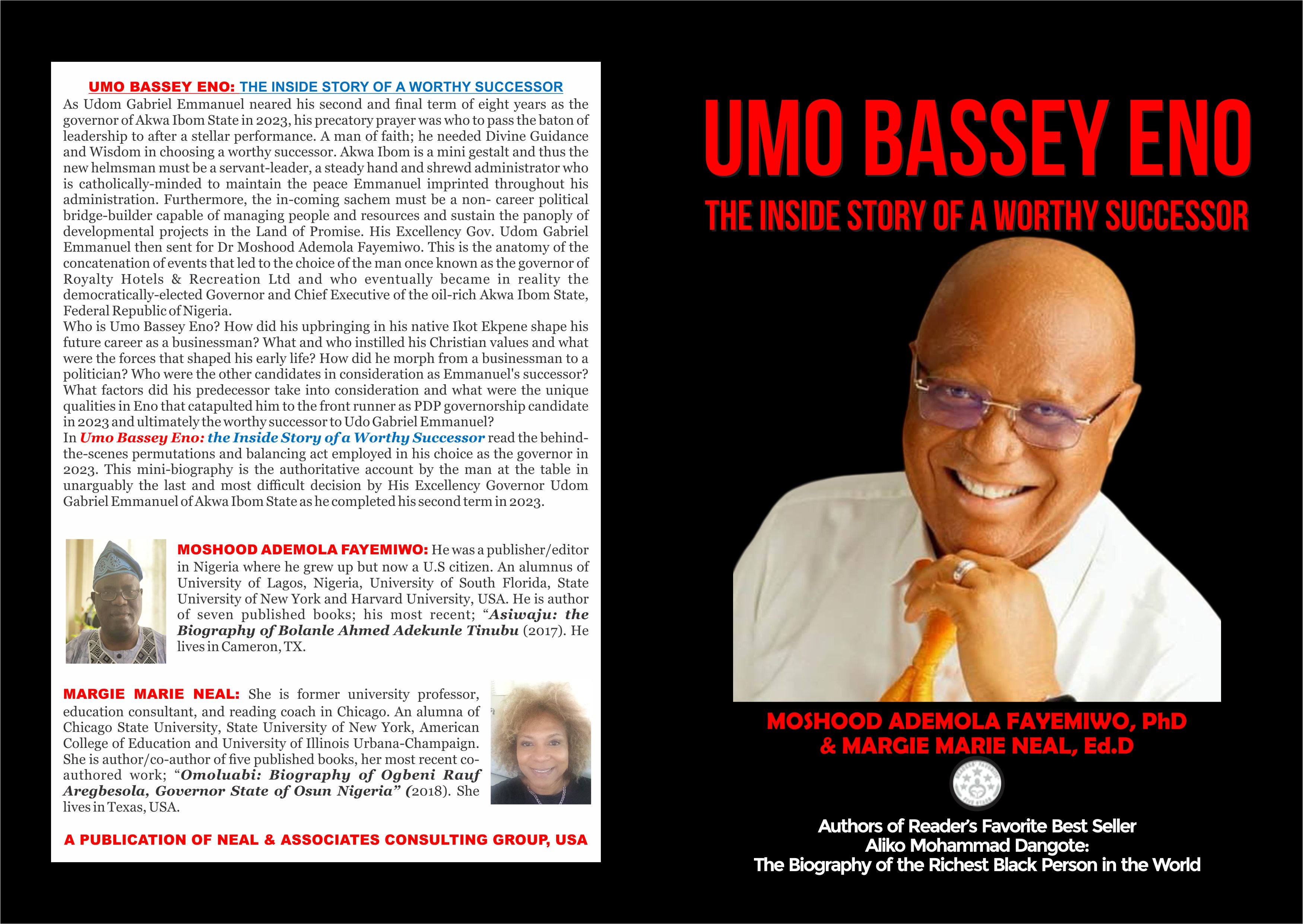 In Umo Bassey Eno: the Inside Story of a Worthy Successor read the behind-the-scenes permutations and balancing act employed in his choice as the governor in 2023. This mini-biography is the authoritative account by the man at the table in unarguably the last and most difficult decision by His Excellency Governor Udom Gabriel Emmanuel of Akwa Ibom State as he completed his second term in 2023.